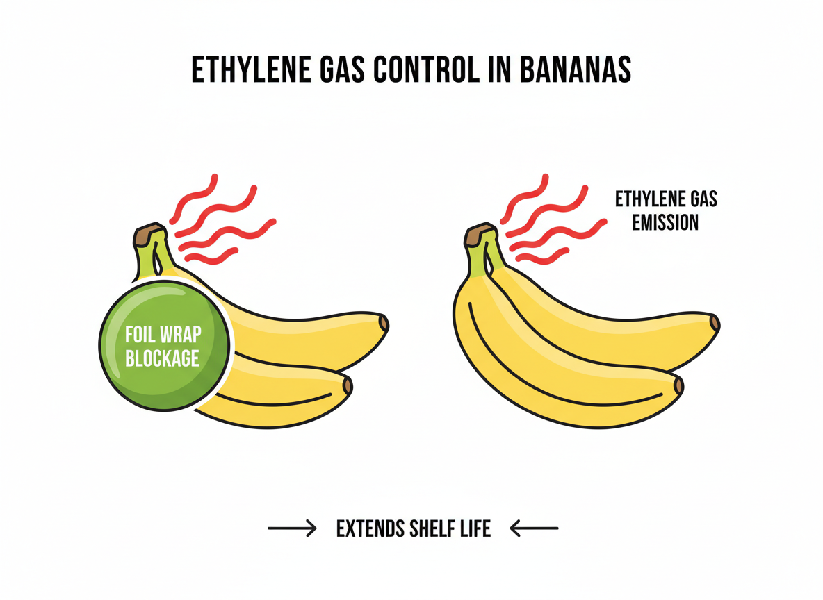 여기서 중요한 팁이 하나 더 있습니다. 바로 '꼭지 감싸기'입니다. 바나나는 스스로를 숙성시키는 '에틸렌 가스'를 방출하는데, 이 가스가 가장 많이 나오는 곳이 바로 꼭지 부분입니다. 알루미늄 호일이나 랩으로 바나나 꼭지 부분을 단단히 감싸주세요. 이는 마치 호흡기를 막아 노화를 지연시키는 원리와 같습니다. 자신이 뿜어내는 가스에 스스로 익어버리는 것을 방지하여, 노란 상태를 3~4일 이상 더 유지할 수 있게 해 줍니다.