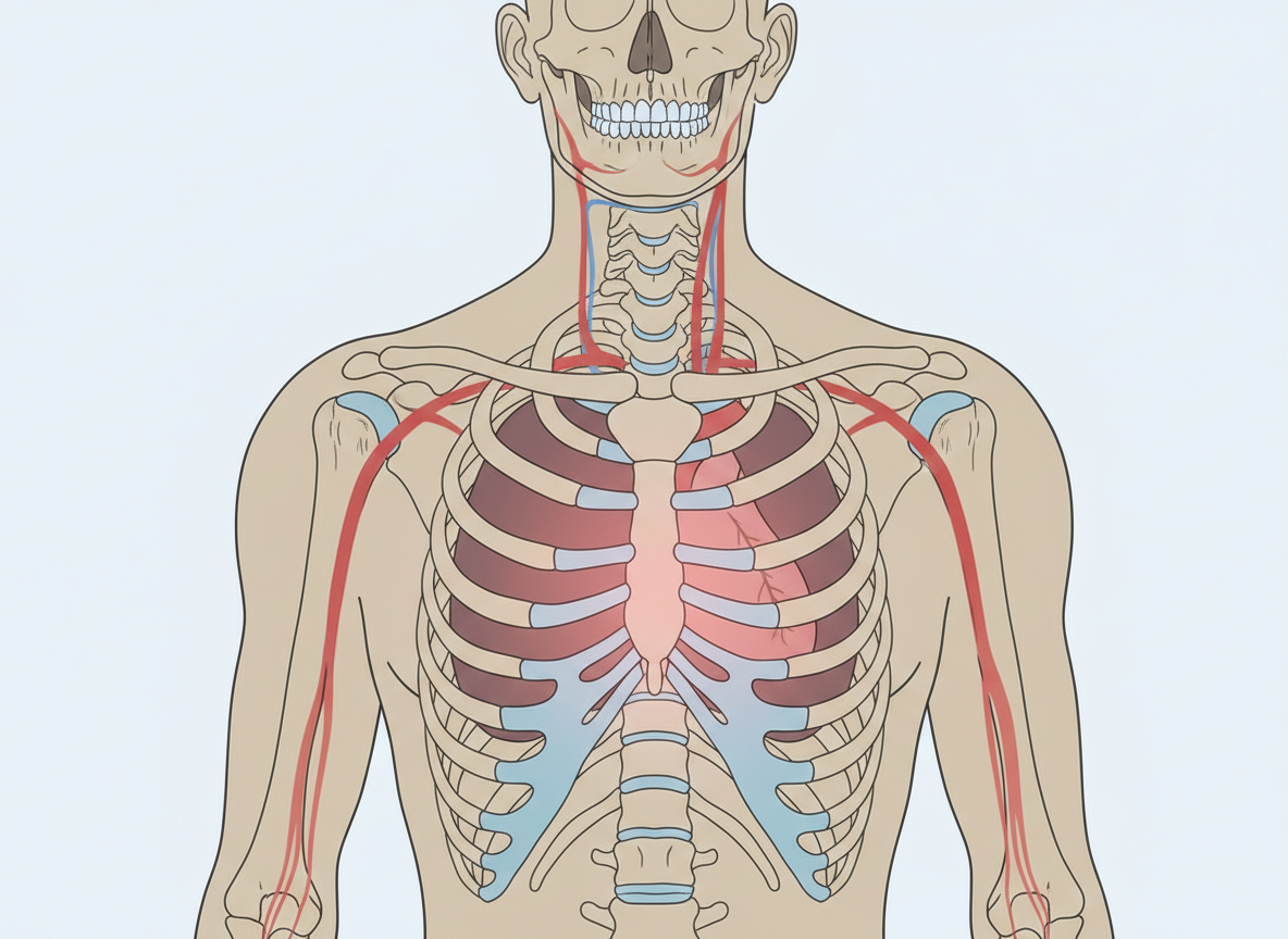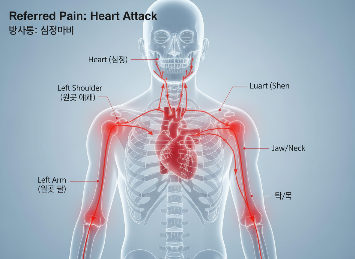 - 방사통 (퍼지는 통증): 통증이 가슴에만 머물지 않고 왼쪽 어깨, 팔 안쪽, 심지어 턱이나 목 부위까지 퍼져나가는 증상이 동반된다면 심혈관 질환일 확률이 매우 높습니다.