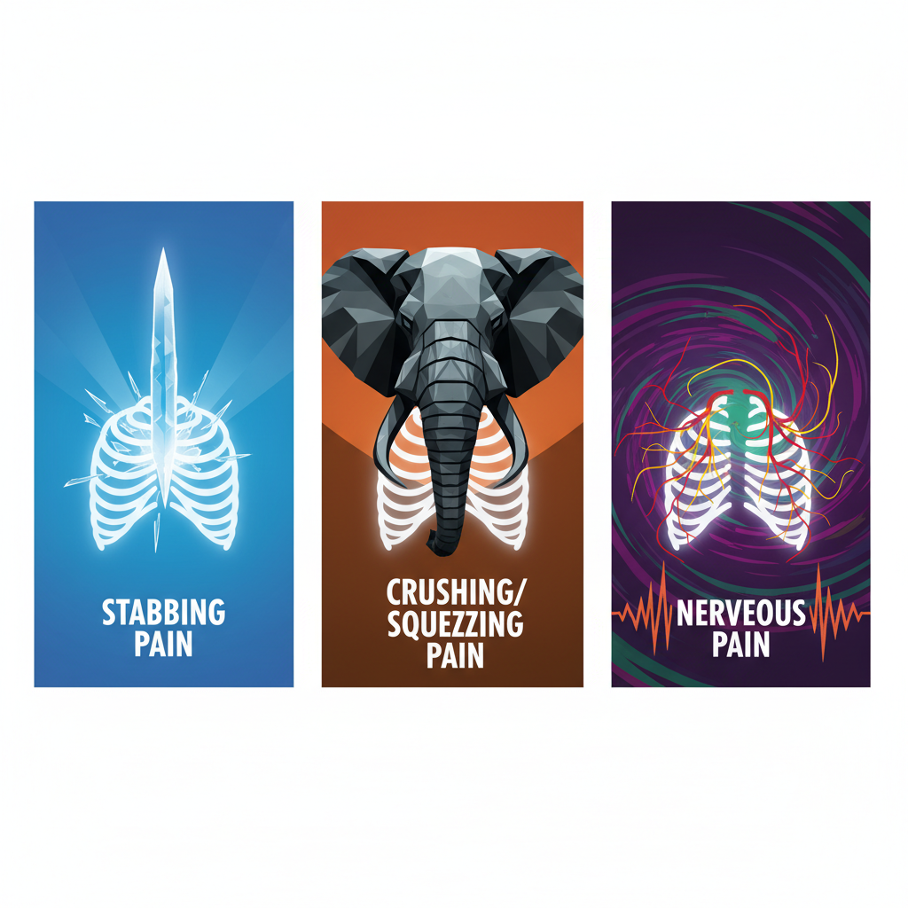 - 쥐어짜는 듯한 뻐근함: 가슴 정중앙이나 좌측 가슴을 누군가 무거운 돌로 누르는 듯한 압박감, 혹은 쥐어짜는 듯한 통증이 나타납니다. 환자분들은 흔히 "가슴이 뻐개지는 것 같다", "코끼리가 가슴을 밟고 있는 것 같다"라고 표현합니다.