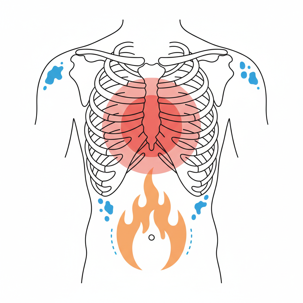 역류성 식도염으로 인한 흉통은 쥐어짜는 느낌보다는 '가슴뼈 뒤쪽이 타는 듯한 쓰라림' 또는 '명치부터 목구멍까지 화끈거리는 느낌'에 가깝습니다. 특히 과식을 하거나 야식을 먹고 난 직후, 자려고 누웠을 때, 몸을 앞으로 숙일 때 증상이 심해지는 특징이 있습니다. 따뜻한 물을 마시거나 제산제를 먹으면 통증이 일시적으로 완화되기도 합니다.