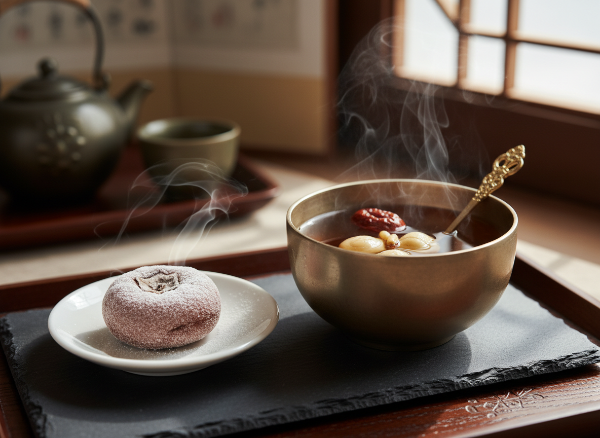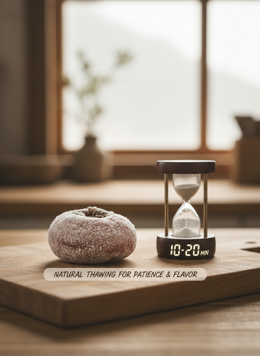 냉동된 곶감을 먹을 때는 '인내심'이 필요합니다. 꽁꽁 언 곶감을 바로 깨물었다가는 치아 손상의 우려가 있습니다. 먹기 전 실온에 약 10분에서 20분 정도 꺼내 두십시오. 자연스럽게 해동되면서 곶감 특유의 쫄깃함은 살아나고, 차가운 기운이 샤베트처럼 어우러져 색다른 별미를 선사합니다. 특히 반건시의 경우, 살짝 얼어있는 상태가 오히려 식감이 더 훌륭할 때가 많습니다. 따뜻한 수정과나 차와 함께 곁들인다면, 그 어떤 고급 호텔 디저트도 부럽지 않을 것입니다.