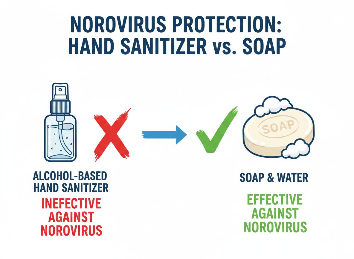 A: 아니요, 노로 바이러스는 알코올 저항성이 강해 일반 손 소독제로는 제거되지 않습니다. 반드시 흐르는 물에 비누로 30초 이상 손을 씻어야 합니다.