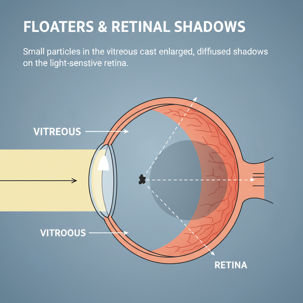비문증은 눈의 젤리 같은 물질인 유리체에 혼탁이 생겨 망막에 그림자를 드리우는 현상을 말해요. 쉽게 말해, 눈 속에 미세한 이물질이 떠다니면서 마치 날파리나 실타래, 혹은 검은 점처럼 보이는 거죠. 이건 실제로 존재하는 외부의 이물질이 아니라, 눈 속에서 생기는 그림자라는 점이 중요해요. 눈을 움직일 때마다 같이 움직이는 것처럼 보여서 더욱 신경 쓰이는 증상이기도 합니다.