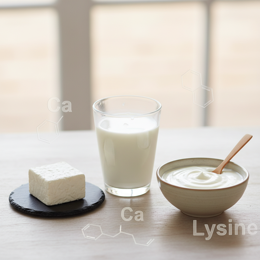 - 유제품(요거트, 우유): 우유와 치즈, 요거트는 리신 함량이 매우 높습니다. 특히 프로바이오틱스가 풍부한 요거트는 장내 면역 세포를 활성화하여 전신 면역력을 끌어올리는 데 탁월합니다. 단, 설탕이 많이 들어간 가공유보다는 플레인 제품을 선택하세요.