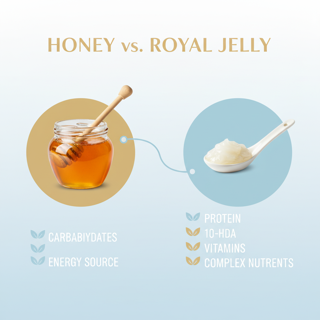 로얄제리는 꿀과 혼동하기 쉽지만, 전혀 다른 물질이에요. 꿀은 탄수화물이 주성분인 에너지원이지만, 로얄제리는 단백질, 지방, 비타민, 미네랄 등 훨씬 복합적인 영양소를 함유하고 있으며 특히 로얄젤리에만 있는 특별한 성분인 10-HDA (10-하이드록시-2-데센산)가 풍부합니다. 이 10-HDA가 로얄제리의 핵심 효능을 만들어내는 주역 중 하나라고 생각하시면 됩니다.