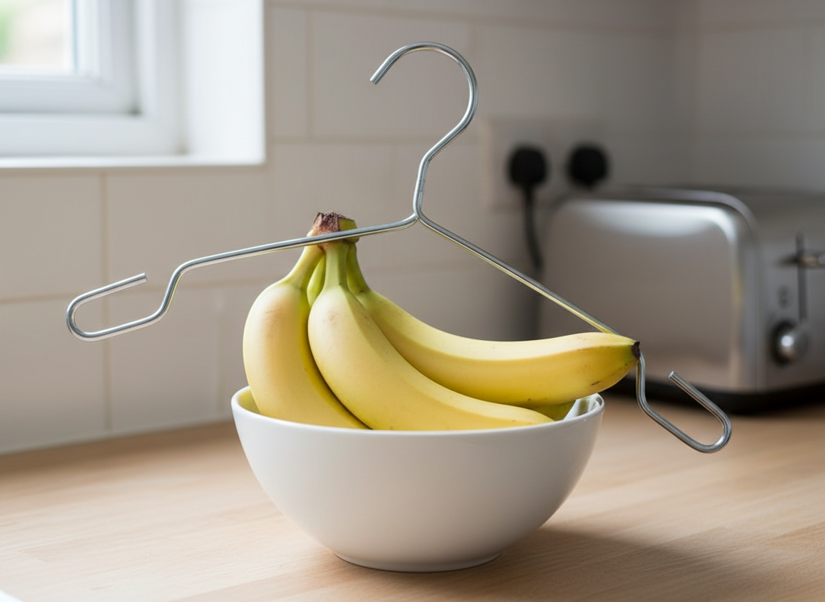 바나나를 바닥에 닿게 두는 것은 '욕창'을 만드는 지름길입니다. 바나나의 무게 때문에 바닥에 닿은 면이 눌리면서 그 부분부터 빠르게 상하기 시작하죠. 그래서 필요한 것이 바로 '바나나 걸이'입니다. 공중에 띄워두면 통풍이 원활해지고 눌리는 면이 없어서 훨씬 오래갑니다. 만약 전용 걸이가 없다면 옷걸이를 활용하거나 끈으로 매달아 두는 것도 훌륭한 대안이 됩니다.