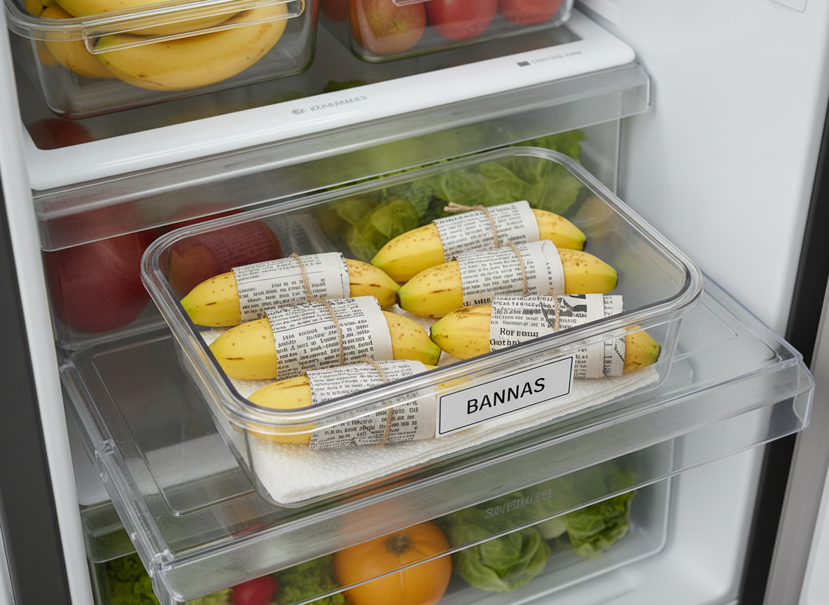 가장 추천하는 냉장 보관법은 다음과 같습니다. 먼저 바나나 껍질을 벗기지 않은 상태에서 하나씩 낱개로 분리합니다. 그다음 신문지나 키친타월로 하나씩 꼼꼼하게 감싸주세요. 이렇게 개별 포장한 바나나를 밀폐 용기나 지퍼백에 넣어 냉장고 채소 칸에 보관하면 됩니다. 종이가 습기를 조절하고 냉기가 직접 닿는 것을 막아주어, 최대 2주까지도 싱싱한 과육을 즐길 수 있습니다. 껍질이 검게 변했다고 해서 놀라지 마세요. 속살은 여러분을 배신하지 않습니다.