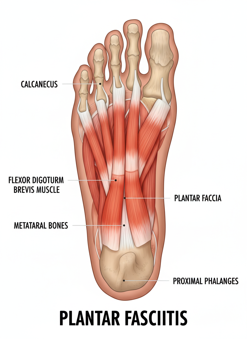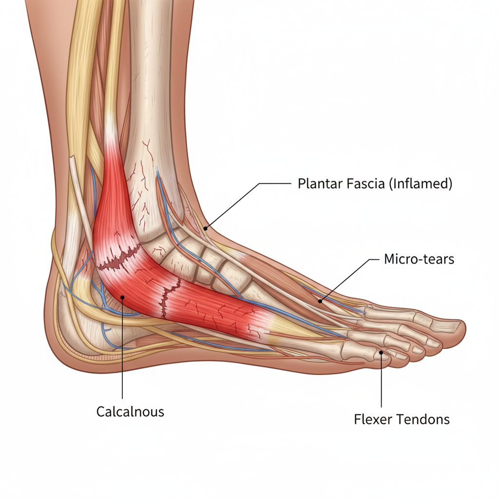 - 주요 증상: 아침 첫발 통증, 발뒤꿈치 또는 발바닥 중앙 통증.