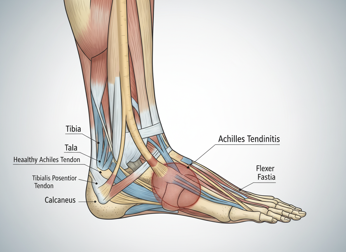 - 주요 증상: 뒤꿈치 위쪽, 아킬레스건 부위 통증, 움직일 때 심해짐.