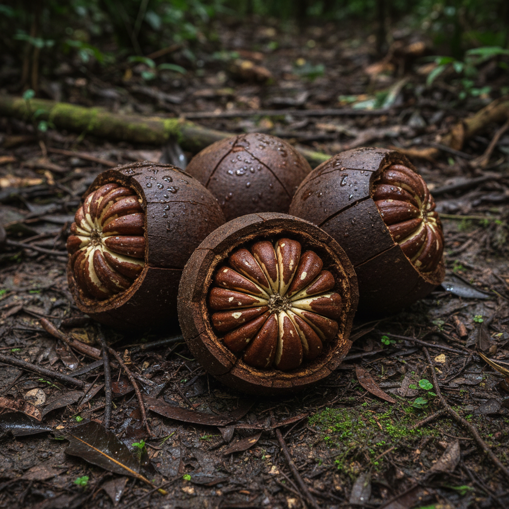 브라질너트는 브라질, 볼리비아, 페루 등 아마존 밀림에서 자라는 거대한 나무의 열매입니다. 이 나무는 높이가 무려 50m까지 자랄 정도로 웅장하며, 수명도 수백 년에 달한다고 해요. 인위적인 재배가 거의 불가능해 오직 야생에서 채취하는 귀한 식재료이기도 합니다.