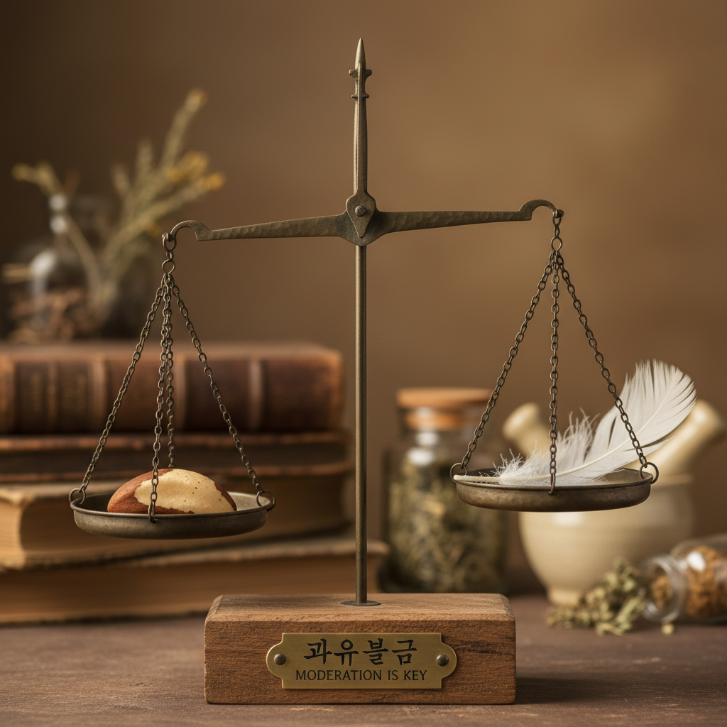 브라질너트의 가장 큰 장점은 셀레늄이지만, 아이러니하게도 가장 조심해야 할 부분 역시 셀레늄입니다. '셀레늄 중독(Selenosis)'이라는 말이 있을 정도로 과다 섭취는 위험할 수 있습니다.