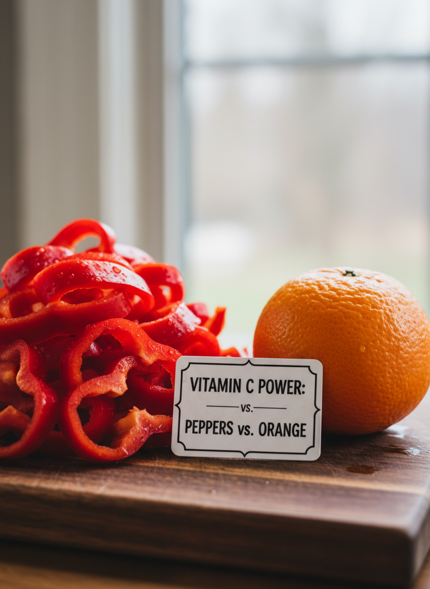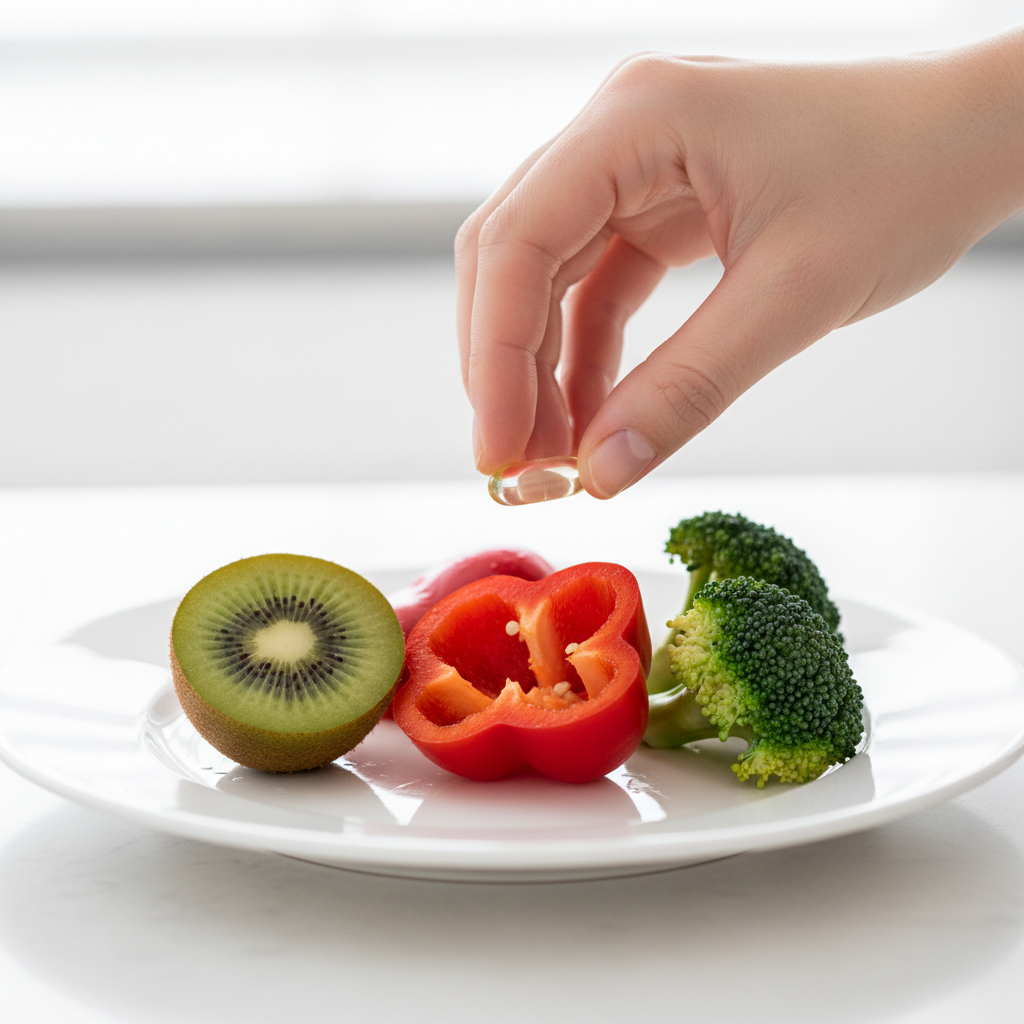 놀랍게도 우리가 비타민의 대명사로 여기는 오렌지나 레몬보다 더 강력한 공급원들이 주변에 많습니다. 예를 들어, 붉은 피망 반 개에는 오렌지 3개 분량의 비타민 C가 들어있고, 브로콜리나 키위 또한 훌륭한 급원입니다. 하루 세끼 식단에 신선한 채소를 한 접시씩만 곁들여도, 굳이 고용량 알약을 삼키지 않아도 충분한 권장량을 채울 수 있습니다.