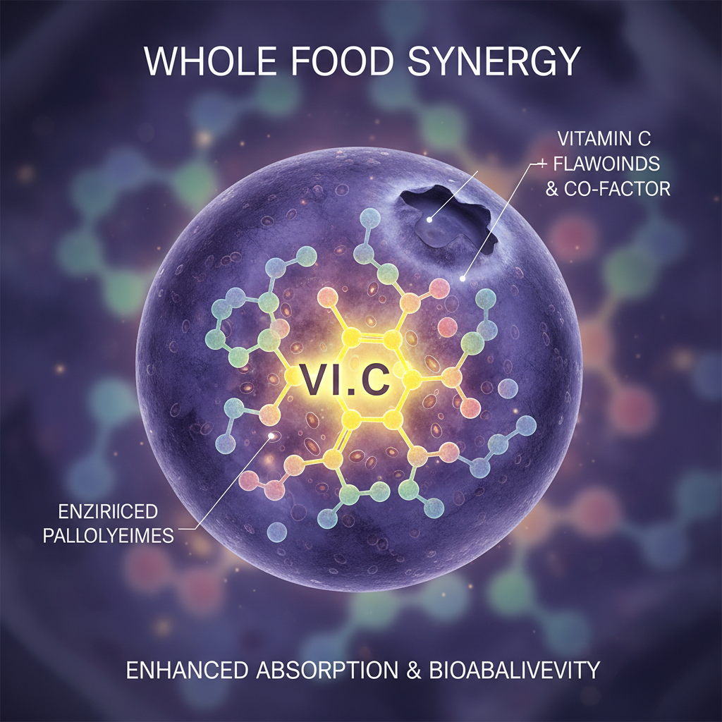 우리는 종종 '비타민 C = 노란색 알약'이라는 공식에 갇혀 있습니다. 하지만 생화학적으로 볼 때, 합성 비타민과 천연 식품 속의 비타민은 분자 구조는 같을지라도 몸에서의 작용은 다를 수 있습니다. 채소와 과일에는 비타민 C 외에도 플라보노이드, 미네랄 등 수많은 보조 인자가 함께 들어있어 흡수와 대사를 돕습니다.