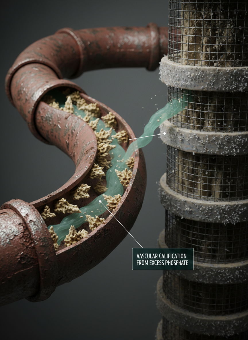 식물성 식품에 들어있는 인은 우리 몸에 40% 정도만 흡수되지만, 가공식품에 들어가는 무기 인은 거의 100% 흡수되어 혈관을 타고 콩팥으로 직행합니다. 이는 마치 정수기 필터에 끈적한 기름때를 붓는 것과 같습니다. 배출되지 못한 인은 뼈를 약하게 만들고 혈관 석회화를 유발하니, 가능하면 원물 고기를 삶거나 굽는 방식으로 드시는 것이 현명합니다.
