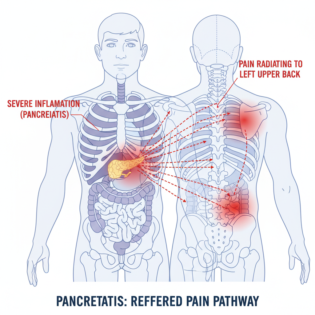 - 췌장염: 췌장은 우리 몸의 왼쪽 상복부 뒤쪽에 위치합니다. 췌장염이 발생하면 심한 복통과 함께 왼쪽 등쪽으로 통증이 퍼질 수 있어요. 식사 후 통증이 심해지는 경향이 있습니다.