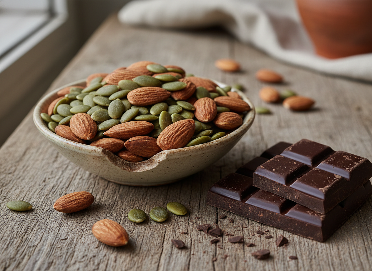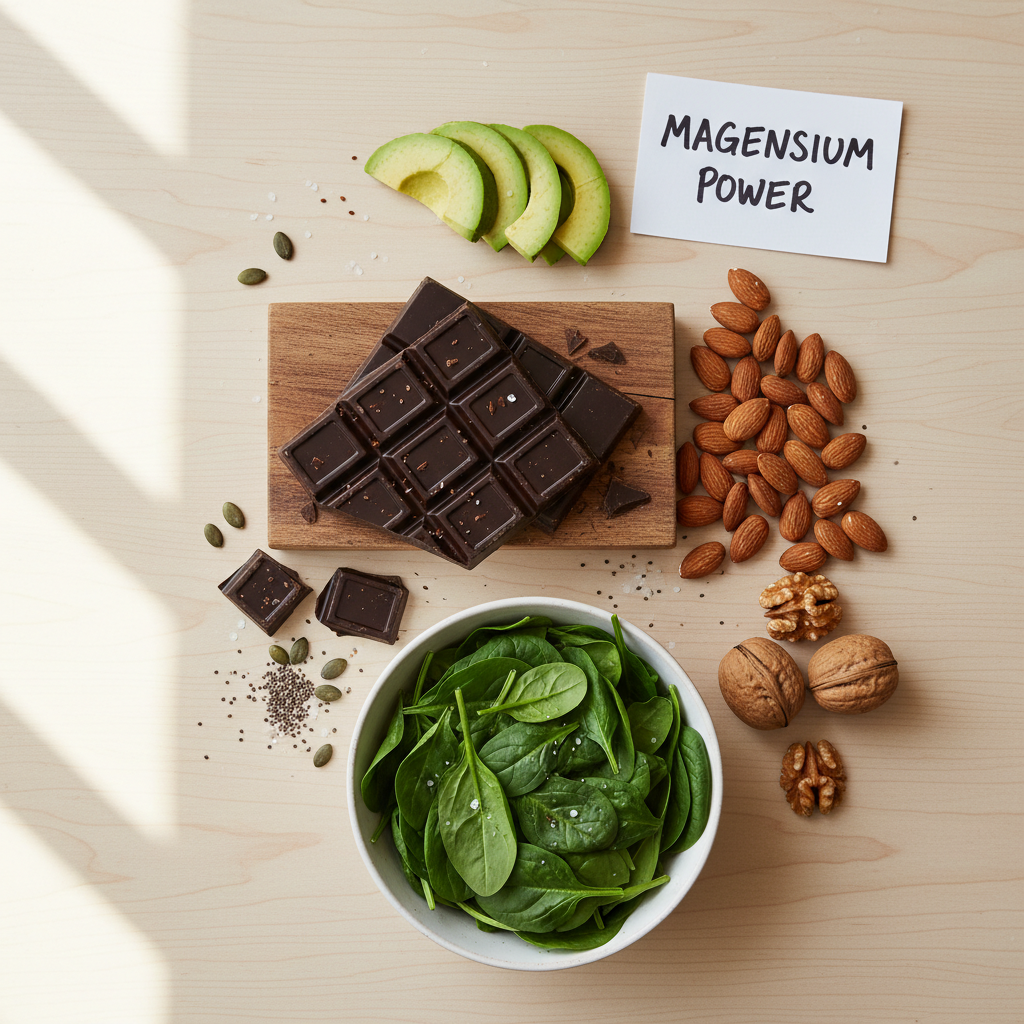 | 마그네슘 | 견과류, 씨앗류, 다크 초콜릿, 콩류 |