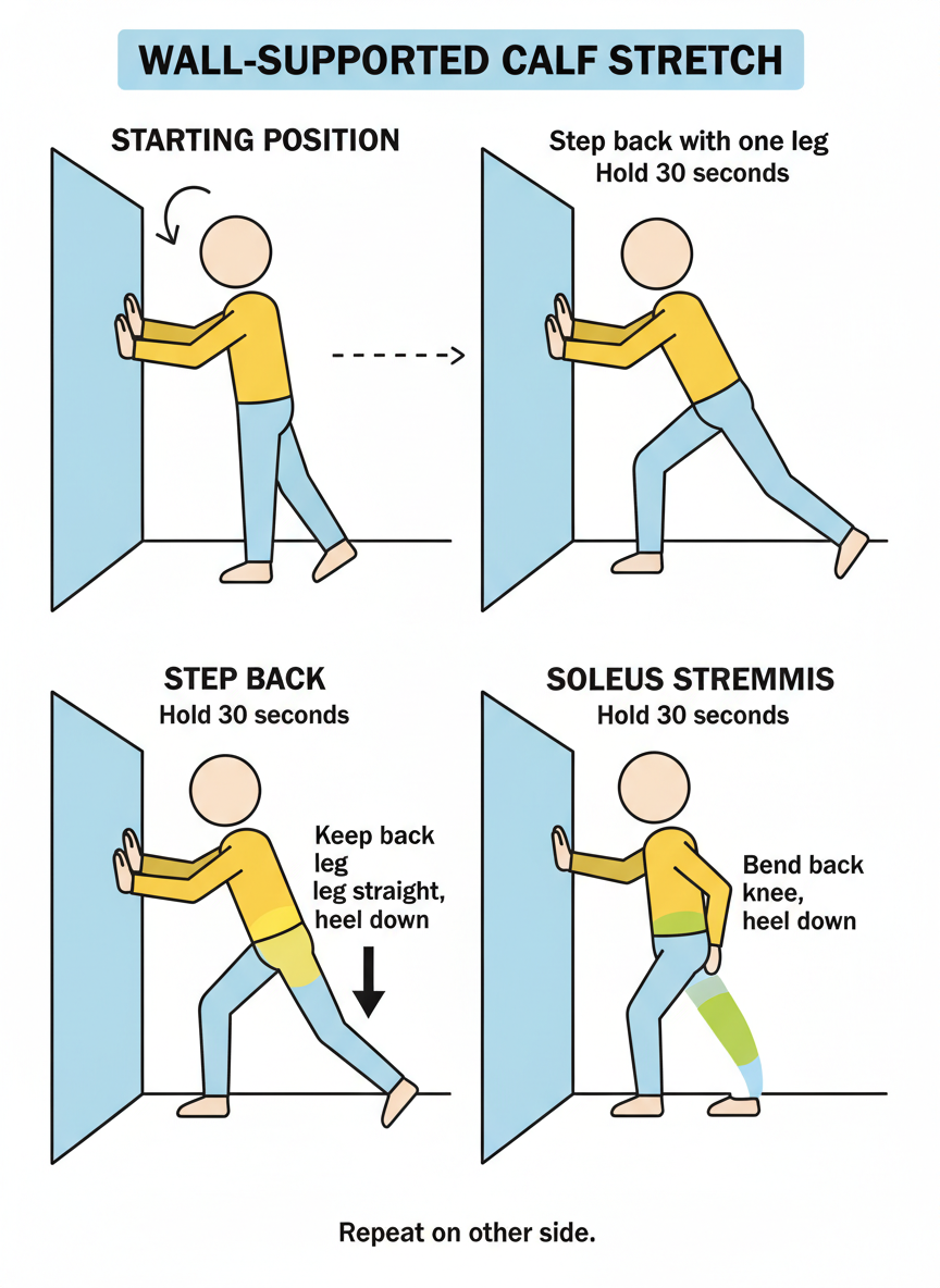 잠자리에 들기 전 5~10분 정도 가볍게 종아리 스트레칭을 해주면 근육의 긴장을 풀어주고 혈액순환을 돕는 데 효과적입니다. 특히 발목을 앞뒤로 움직이거나, 벽에 손을 짚고 종아리를 쭉 늘려주는 동작이 좋아요. 따뜻한 물에 샤워하거나 족욕을 하는 것도 근육 이완에 도움을 줄 수 있습니다. 부드러운 마사지로 근육을 풀어주는 것도 잊지 마세요.