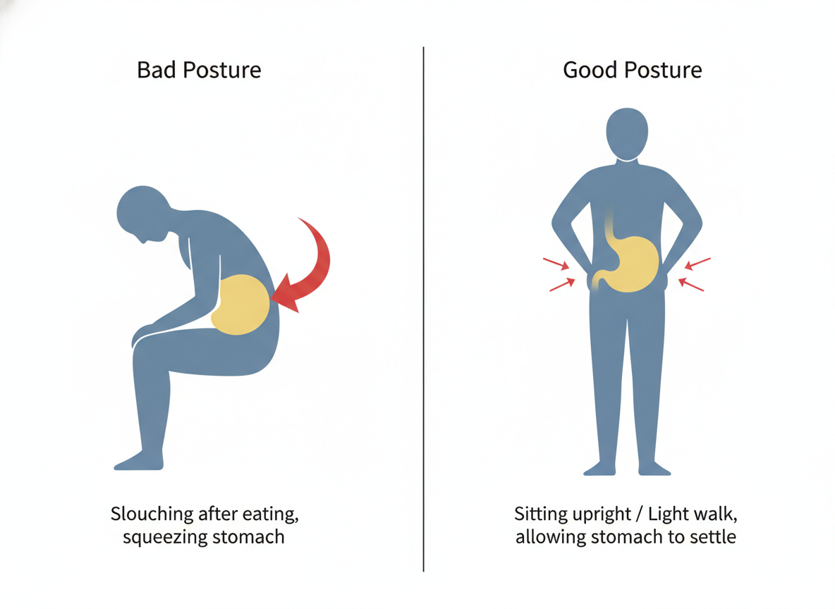 A: 식사 후 바로 눕지 말고 30분 정도 가볍게 산책하거나 앉아 있는 것이 좋습니다. 왼쪽으로 누우면 위장의 구조상 역류를 줄이는 데 일시적인 도움이 될 수 있습니다.