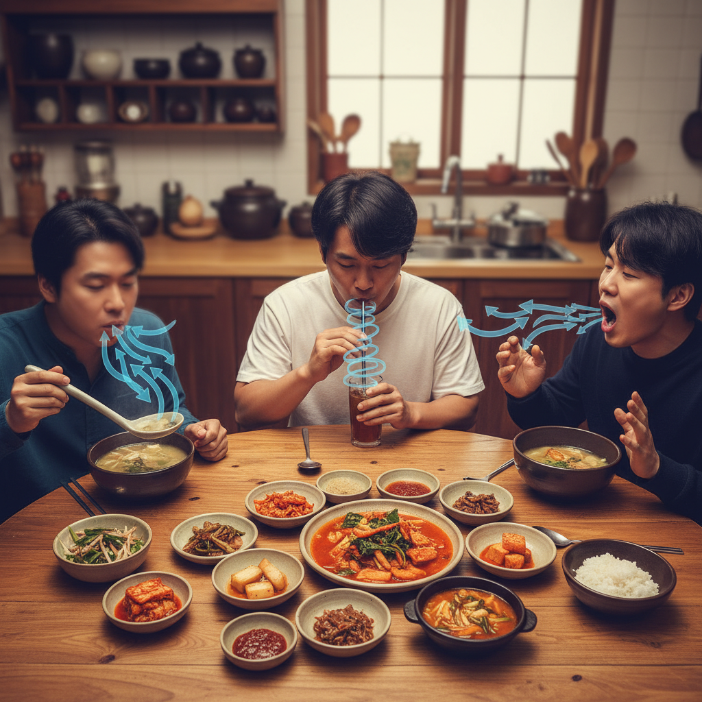 특히 한국인의 식습관 중 '빨리 먹기', '국물 후루룩 마시기', '식사 도중 말 많이 하기'는 공기 섭취량을 폭발적으로 늘립니다. 위장은 들어온 공기를 견디다 못해 다시 식도로 밀어 올리는데, 이것이 바로 연속적인 트림입니다. 마치 튜브에 바람을 과하게 넣으면 주입구로 바람이 새어 나오는 원리와 똑같습니다.