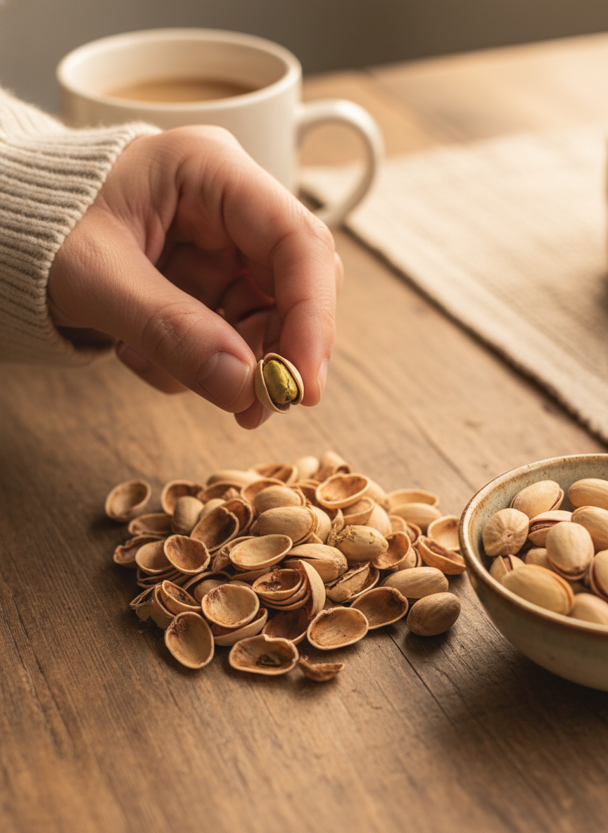 다이어트를 할 때 가장 힘든 게 바로 '허기'죠? 피스타치오는 식이섬유와 단백질이 풍부해 포만감을 오랫동안 유지해 줍니다. 특히 '피스타치오 원리(The Pistachio Principle)'라는 게 있는데요. 껍질을 직접 까서 먹는 과정이 시각적인 피드백을 주어 뇌가 음식을 더 많이 먹었다고 착각하게 만들어 섭취량을 조절하는 데 도움을 줍니다.