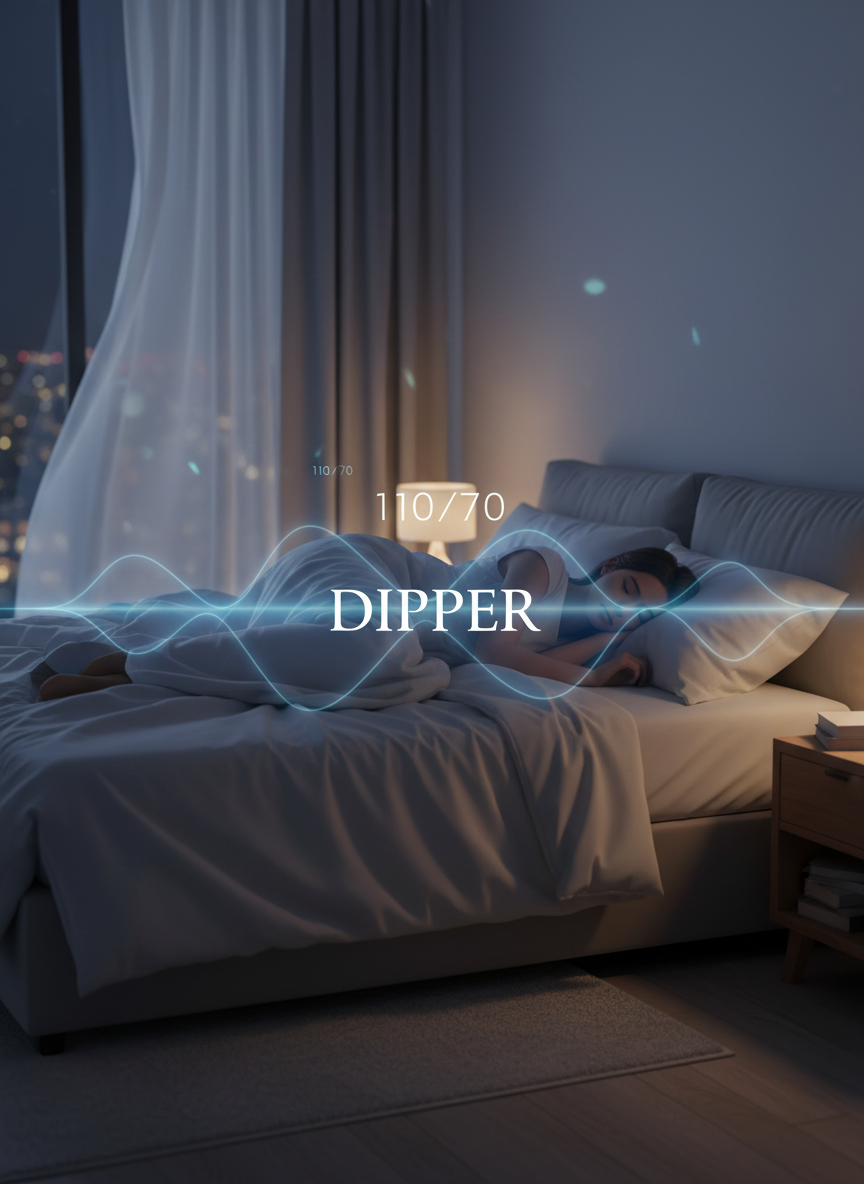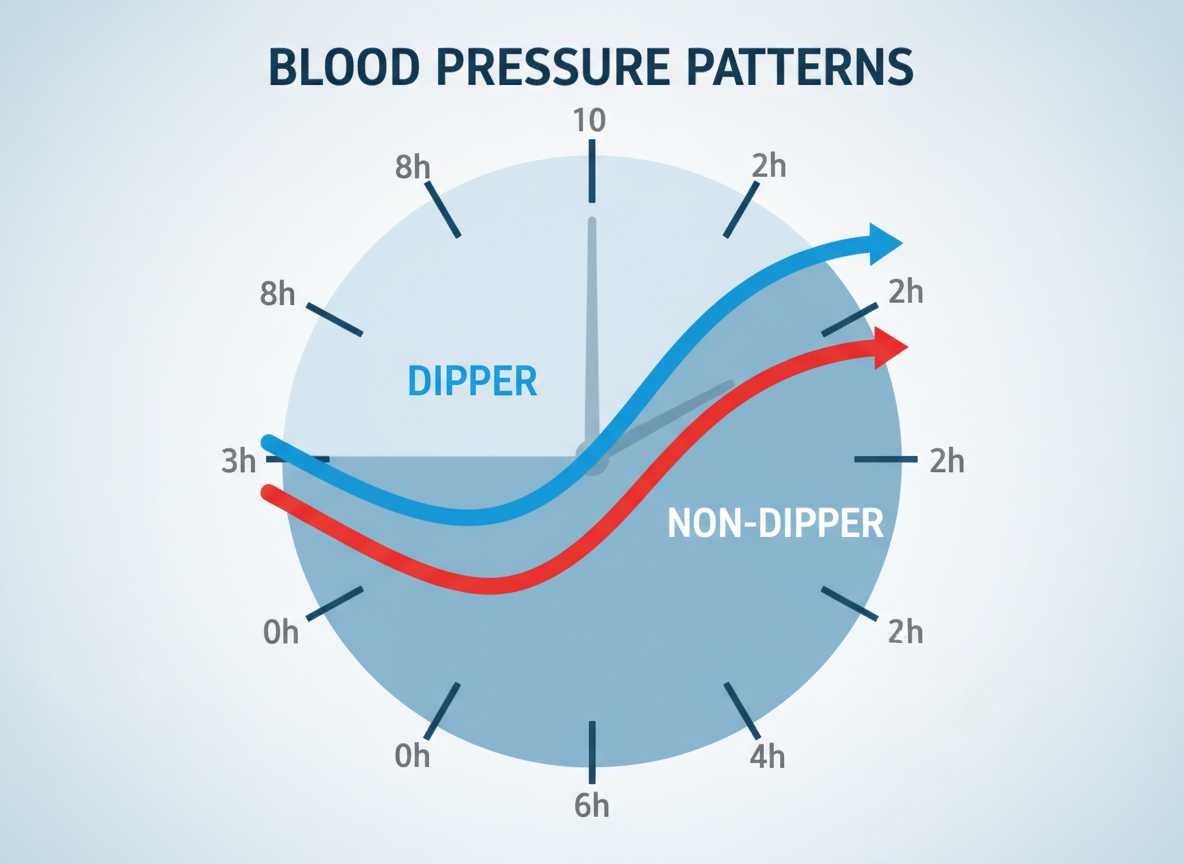 하지만 모든 사람에게 아침이 정답은 아닙니다. 여기서 우리는 '야간 혈압'이라는 개념에 주목해야 합니다. 정상적인 경우라면 수면 중에는 혈압이 낮보다 10~20% 정도 떨어져야 합니다. 이를 '디퍼(Dipper)'라고 부릅니다. 그런데 일부 환자들은 밤이 되어도 혈압이 떨어지지 않거나, 오히려 상승하는 기이한 현상을 보입니다. 이들을 '논디퍼(Non-dipper)' 또는 '라이저(Riser)'라고 칭합니다.