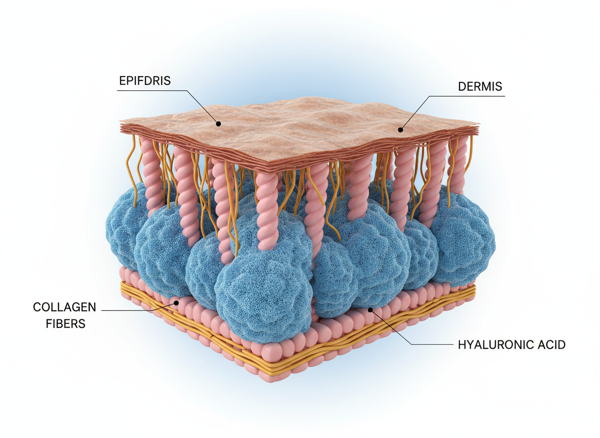 히알루론산을 설명할 때 가장 흔히 쓰는 비유가 바로 '스펀지'입니다. 우리 피부의 진피층에는 콜라겐과 엘라스틴이라는 기둥이 있고, 그 사이를 채우고 있는 것이 바로 히알루론산입니다. 이 성분은 놀랍게도 자기 무게의 300배에서 최대 1,000배에 달하는 수분을 끌어당겨 머금는 성질을 가지고 있습니다. 마치 마른 스펀지가 물을 만나면 순식간에 부풀어 오르는 것과 같죠.