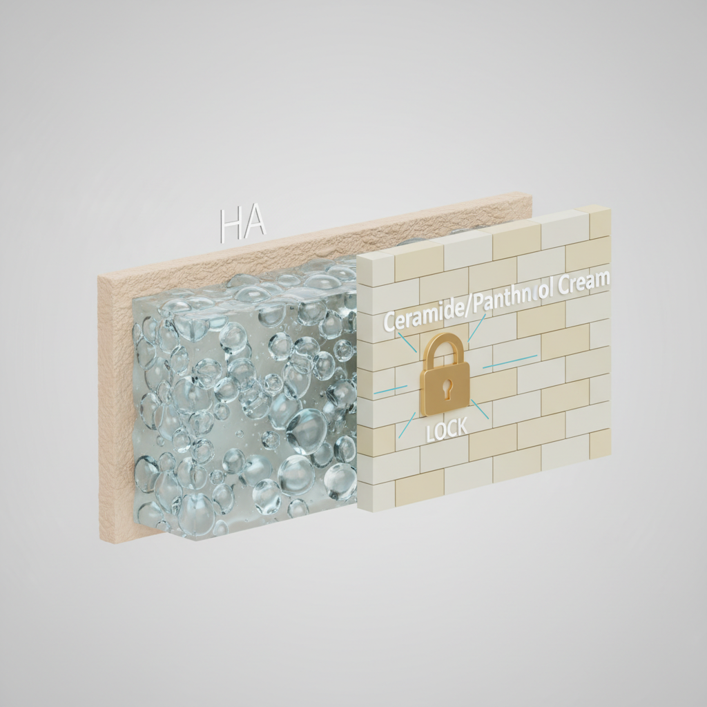 히알루론산 하나만으로는 수분을 '지키는' 능력이 다소 부족할 수 있습니다. 수분을 공급했다면, 그것이 날아가지 않도록 잠가주는 자물쇠가 필요하죠. 이때 가장 좋은 짝꿍이 바로 '세라마이드'와 '판테놀'입니다. 히알루론산으로 물길을 열어주고, 세라마이드 크림으로 덮어주면 그야말로 완벽한 철통 방어가 완성됩니다.